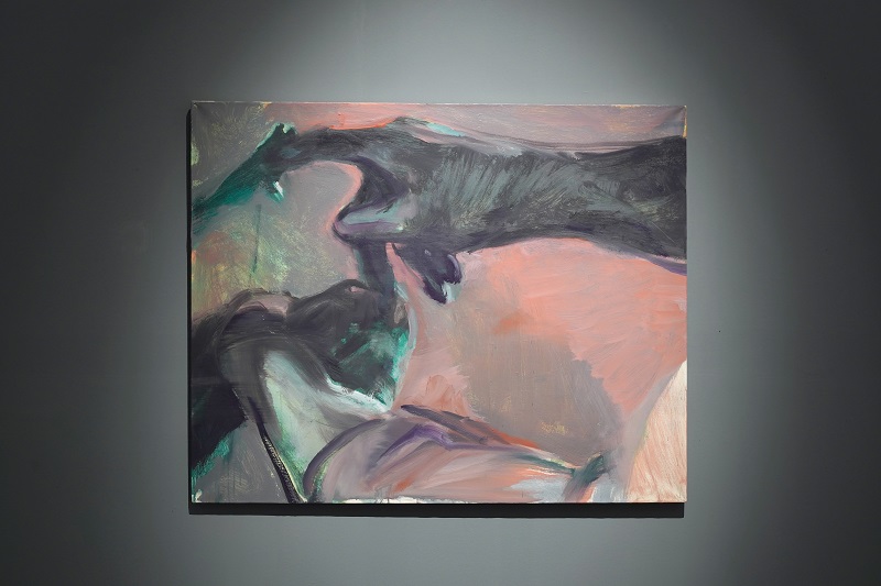 In one of the paintings, which shows hands leaning against a wall, while a finger penetrates a hole in its surface, Bataille’s transgressive impulse is readable – the moment in which touch becomes the inscription of desire, and the act of crossing the border becomes the central motif.