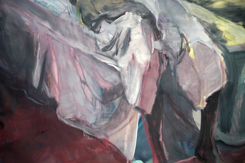 I think that a painting is not something that is viewed exclusively from a distance, but the space in which the artist is located also within it. Thus, the spatial expansion of the image and its perceptual growth does not remain closed within its dimensions, but visually expands, becoming an experiential space. Conditioned by the space in which I work, making the much-needed distance impossible, working on the painting becomes an almost performative act, bringing me closer to artists like Francis Bacon and Mark Rothko, not necessarily in expression, but in physical involvement and the treatment of coloured fields.