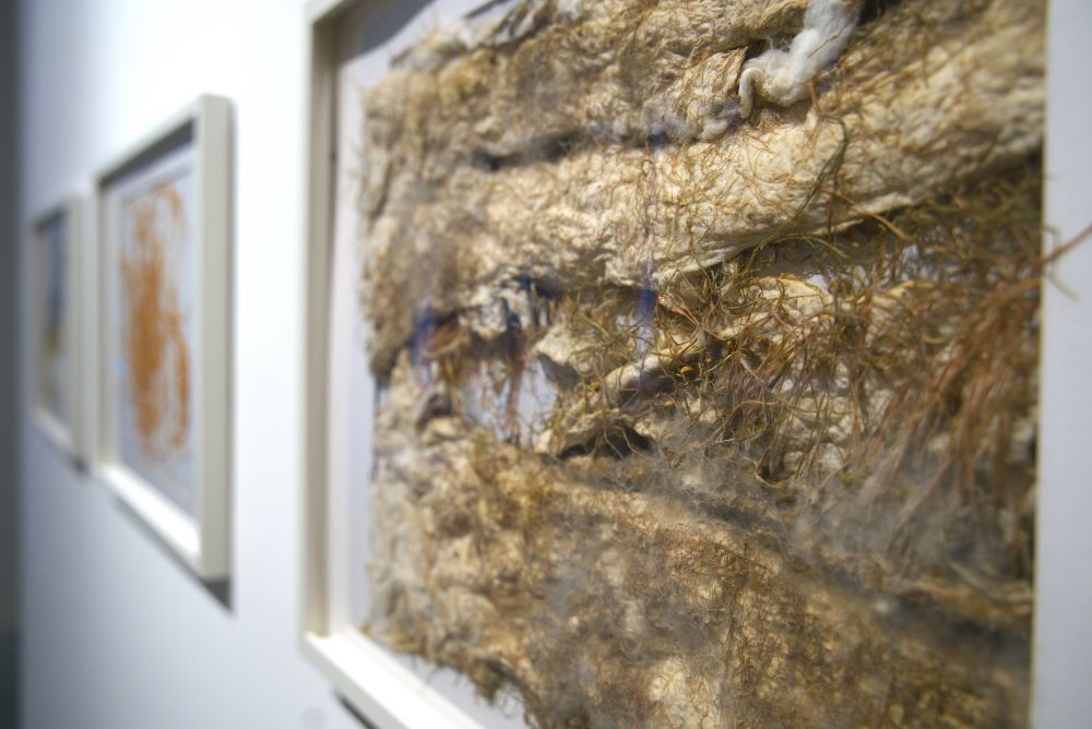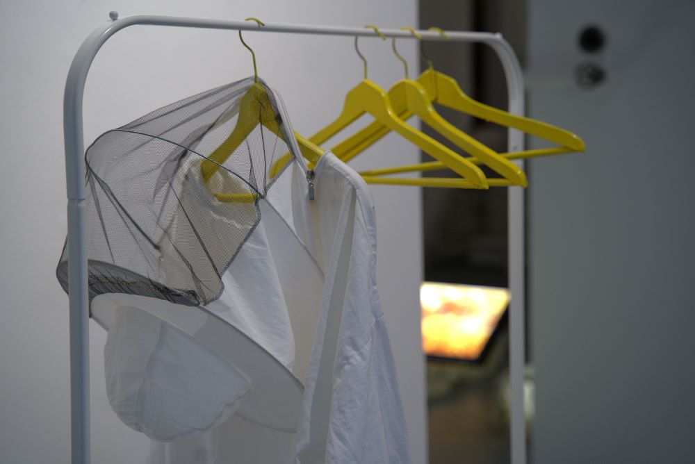 Ukoliko je verovati Borisu Grojsu, umetnička instalacija predstavlja ‘vanredni prostor’ – ona izdvaja određeni prostor iz topologije >običnog< sveta da bi razotkrila njegovu unutarnju prirodu i ograničenja.[2] Centralni topos – život [pčela] – posredovan je onim pojmovima, stvarima i afektima koji ga idejno i estetski okružuju, gravitiraju ka njemu ili se, takoreći, kondenzuju oko njega kroz umetnička dela u preseku prirodne [i] humane intervencije; mikroskopski ogledi iz svakodnevice, trava u belim ramovima i digitalno-vunene scene ili teksture samo su neki od primera koje ti umetnica nudi, obećavajući novi pogled na… stvari ? Čini se da su nam klišei prirode tako daleki u permanentnoj repeticiji njihove mikroforme i organske slučajnosti. Najbolji odgovor na pitanje zašto je atom tako mali je zato što smo mi tako veliki.