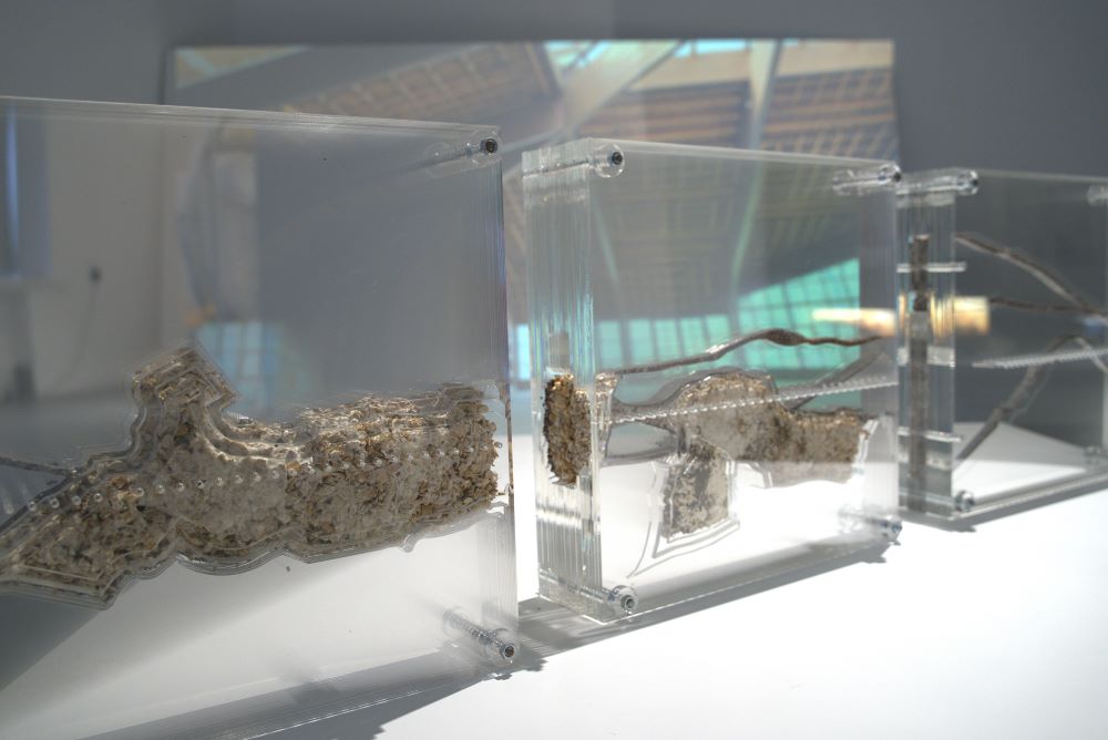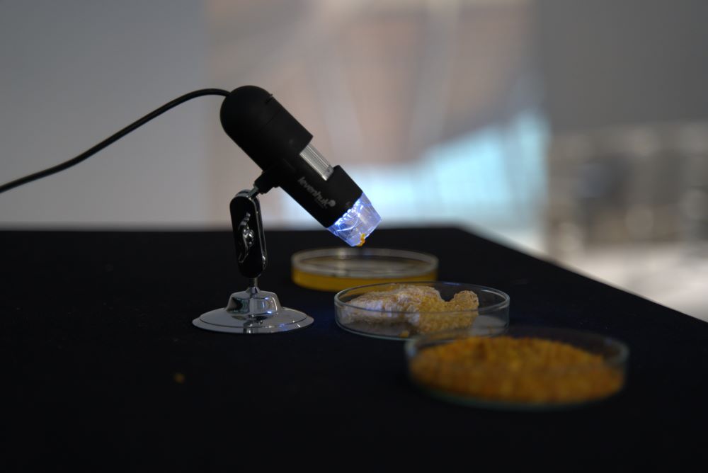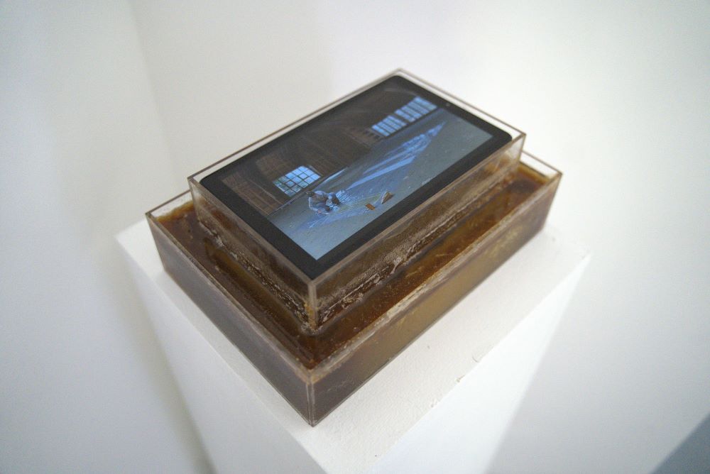 Videli ste travu, omirisali med, možda i dodirnuli pleksiglas… čuli ste zvuk? Ali, sve je to u-obličeno i postavljeno, pred vas, kao niz fragmentarnih iskustva kojima umetnica, igrajući se… životom kao sredstvom i formom umetničkog izraza, prikazuje njegove [ne]vidljive estetske potencijale i simboličke učinke kojih – najčešće – niste ni svesni (šta >znači< pčela i kako po:smatraš pšenicu ili med). Do kraja izložbe, sigurno će se štošta promeniti, a ono čemu sada svedočiš je kadar : frejm prirode u nezaustavljivoj entropiji (čitaj: transformaciji) – koja se upravo ovde događa u in vitro, laboratorijskim uslovima galerijskog prostora. Razbijena „scenografija” stvarnosti kroz sintetičku arhitektoniku čula. Razmišljaš (polako šeta i – ćuti).